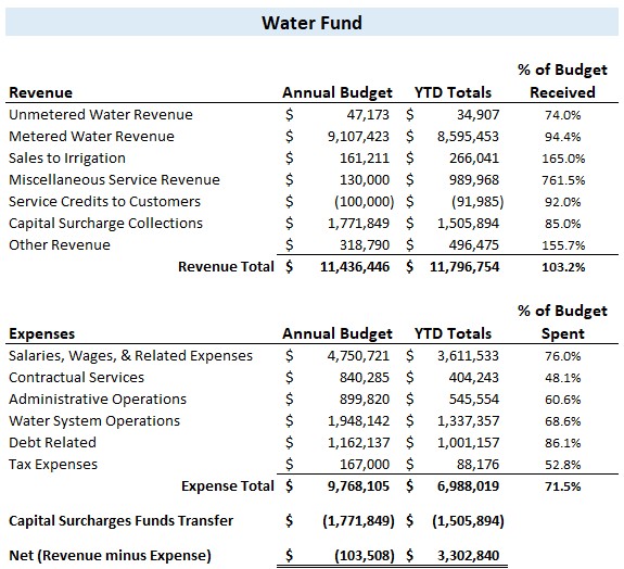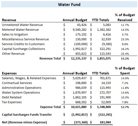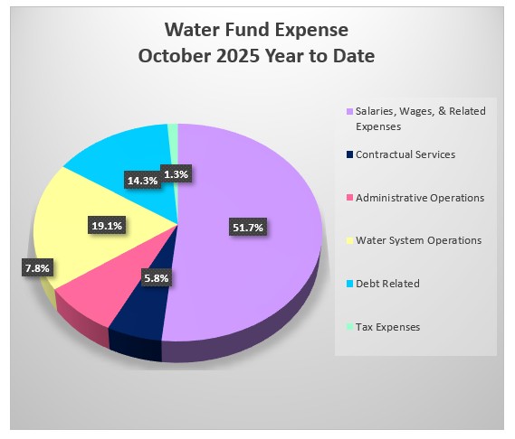 Below is a pie chart depicting the Water Fund Expenses for the current period.